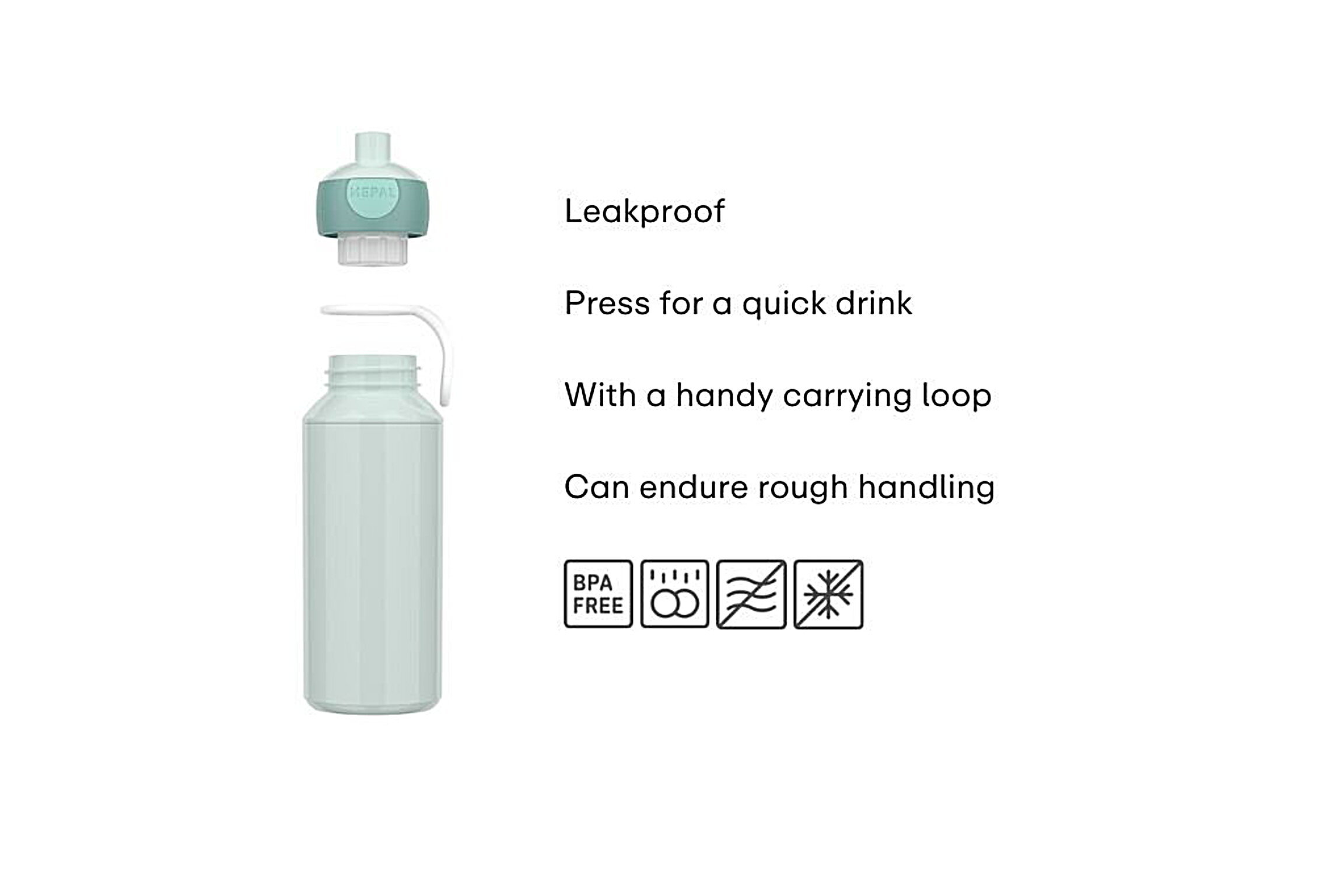 Butelka posiada higieniczny, szczelny dzióbek otwierany za pomocą przycisku. Do butelki dołączony jest zaczep, dzięki któremu bidon można zaczepić do plecaka czy szlufki od spodni.