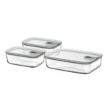 Zestaw trzech pojemników szklanych EasyClip 2.0 Sage to praktyczne i nowoczesne rozwiązanie do przechowywania oraz transportu żywności. W skład zestawu wchodzą dwa pojemniki o pojemności 1000 ml oraz jeden pojemnik o pojemności 2250 ml, co pozwala wygodnie przechowywać zarówno mniejsze porcje, jak i większe dania.